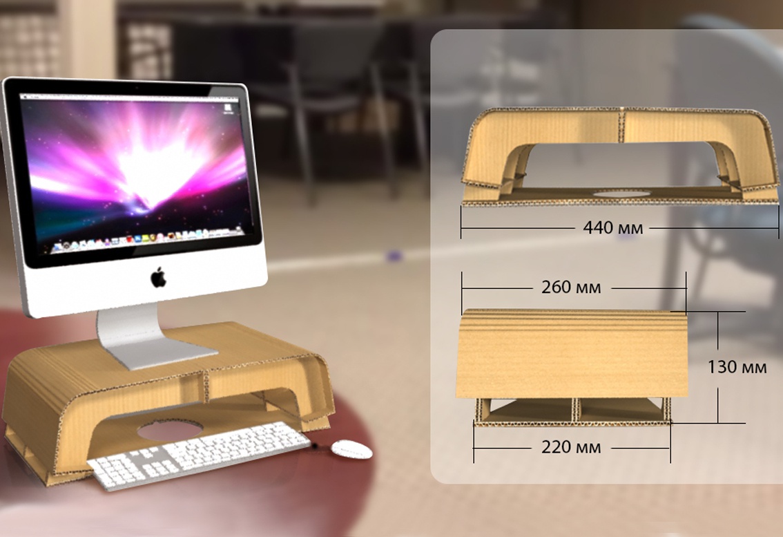 Для тих, хто любить попрацювати за комп'ютером в нестандартних умовах, а також для тих, хто цінує зручність і вибирає натуральні матеріали, представляємо підставку під монітор з високоякісного 5-ти шарового гофрокартону.